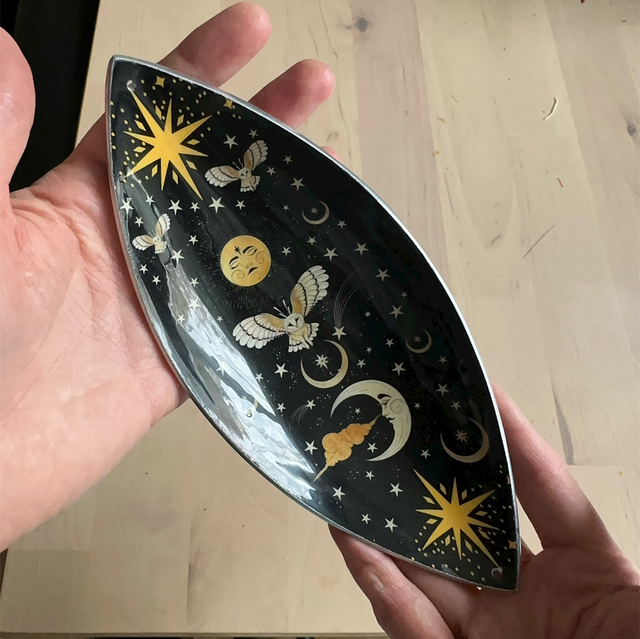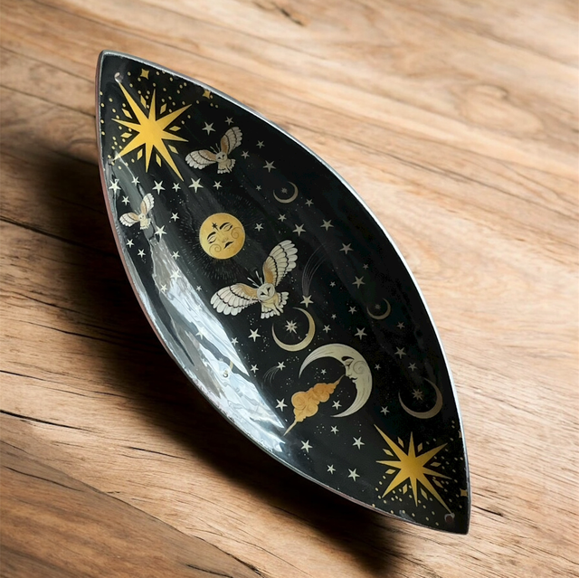 A moody and magical incense bowl featuring an enchanted scene of owls, moons, and stars against a deep night sky. Crafted from lightweight aluminium and finished with a glossy enamel surface, it’s both functional and visually captivating.
