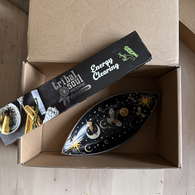 You will receive 1 aluminium incense bowl with an Enchanted Night Owl design, measuring approximately 20x9x2cm and Tribal Soul Spiritual Incense Sticks and Ceramic Holder - Energy Clearing