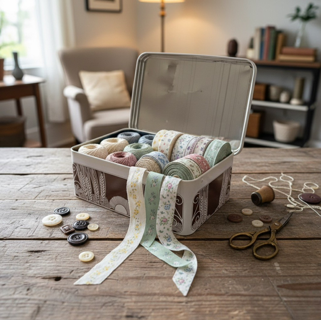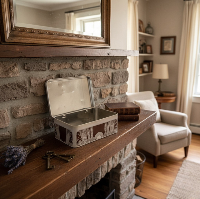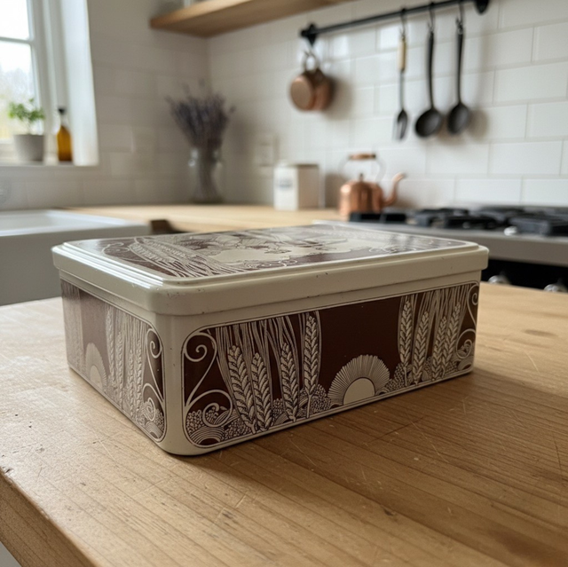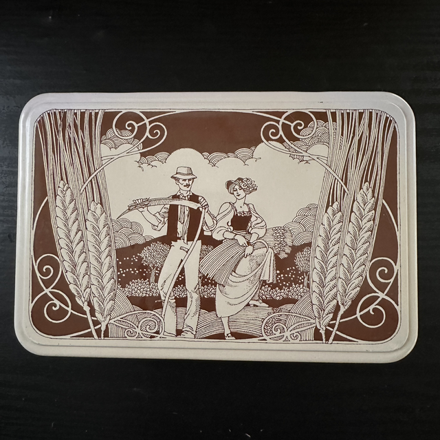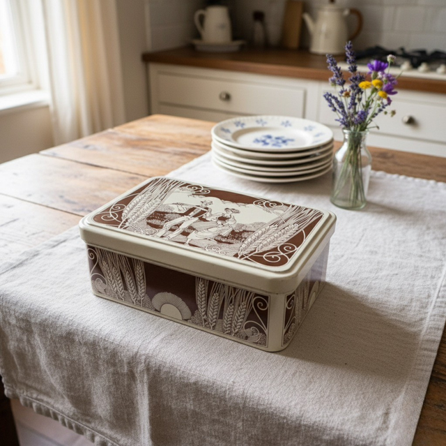 The tin was originally used for cookies or biscuits, designed to keep them fresh, but today it serves beautifully as a decorative item. It can be used for storing small treasures, art supplies, or simply as a nostalgic accent in your kitchen, studio, or café.